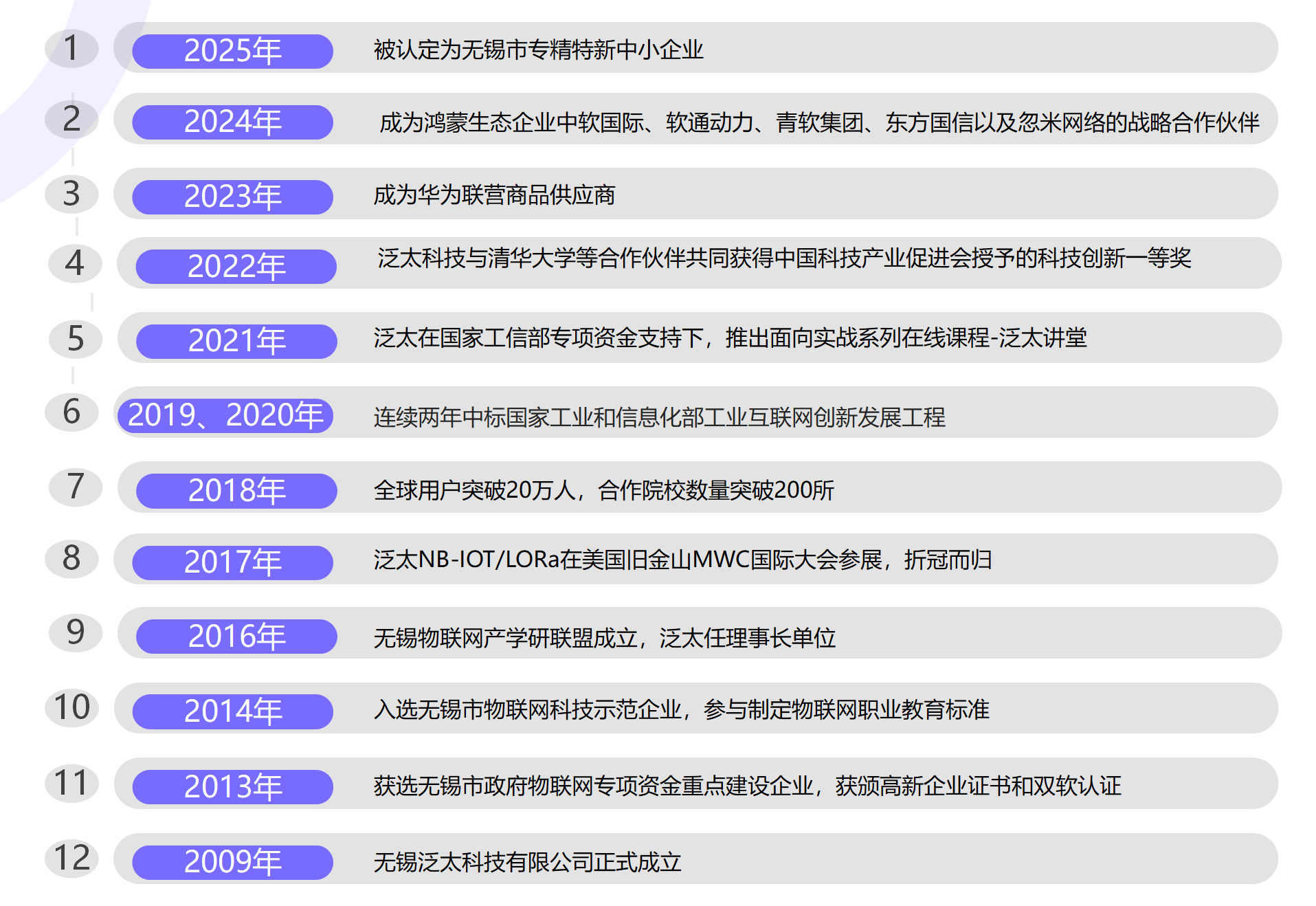 2019、2020年連續兩年中標國家工業(yè)和信息化部工業(yè)互聯(lián)網(wǎng)創(chuàng )新發(fā)展工程;2022年泛太科技與清華大學(xué)等單位合作的《工業(yè)物聯(lián)網(wǎng)智能標識與管控技術(shù)、平臺及應用》項目榮獲中國科技產(chǎn)業(yè)化促進(jìn)會(huì )頒發(fā)的第三屆科學(xué)技術(shù)獎-科技創(chuàng )新一等獎。2023年成為華為聯(lián)營(yíng)商品供應商。2024年成為鴻蒙生態(tài)企業(yè)中軟國際、軟通動(dòng)力、青軟集團、東方國信以及忽米網(wǎng)絡(luò )的戰略合作伙伴。2025年被認定為無(wú)錫市專(zhuān)精特新中小企業(yè)。泛太科技擁有包括發(fā)明專(zhuān)利、實(shí)用新穎專(zhuān)利以及計算機軟件著(zhù)作權在內的中國完全自主知識產(chǎn)權百余項?;谠诠I(yè)互聯(lián)網(wǎng)、鴻蒙系統、智能網(wǎng)聯(lián)、物聯(lián)網(wǎng)、AI人工智能、智慧農業(yè)、軌道交通、無(wú)線(xiàn)傳感器網(wǎng)絡(luò )、射頻識別、嵌入式系統、無(wú)線(xiàn)通信、云計算、機器學(xué)習等領(lǐng)域的技術(shù)積累和工程應用實(shí)踐經(jīng)驗,泛太科技近年來(lái)與國內500余所院校合作共建了多門(mén)類(lèi)的實(shí)驗/實(shí)訓室、實(shí)驗/實(shí)訓中心以及實(shí)踐/實(shí)訓基地,合作院校類(lèi)別涵蓋本科、高職、中職、技工技師以及普教學(xué)校,教培產(chǎn)品與服務(wù)受眾已超過(guò)50萬(wàn)人,泛太科技現已成為中國整體數字技術(shù)教育服務(wù)提供商。