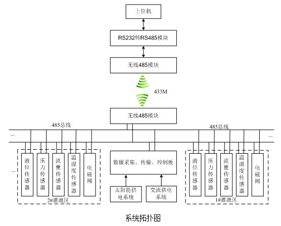 系統主要由各種工業(yè)傳感器、工業(yè)控制設備、數據采集系統、太陽(yáng)能供電系統、無(wú)線(xiàn)485模塊、上位機等組成。其構成拓撲如圖所示。
