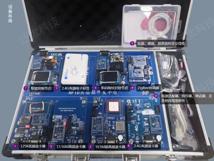 該產(chǎn)品包含125KHz低頻模塊、13.56MHz高頻模塊、915MHz超高頻模塊、2.4GHz有源讀寫(xiě)模塊、條碼指紋節點(diǎn)、智能電機控制節點(diǎn)、以及ZigBee協(xié)調器。實(shí)驗課程重點(diǎn)放在對各個(gè)頻段RFID模塊的管理、控制和上位機程序的應用開(kāi)發(fā)上,學(xué)生可以利用開(kāi)放的通信協(xié)議,使用上位機編程語(yǔ)言(C#)編寫(xiě)上位機應用程序與RFID模塊、二維碼指紋識別節點(diǎn)、智能控制板進(jìn)行數據交互,實(shí)現各種物聯(lián)網(wǎng)應用場(chǎng)景。產(chǎn)品外觀(guān)如圖所示。