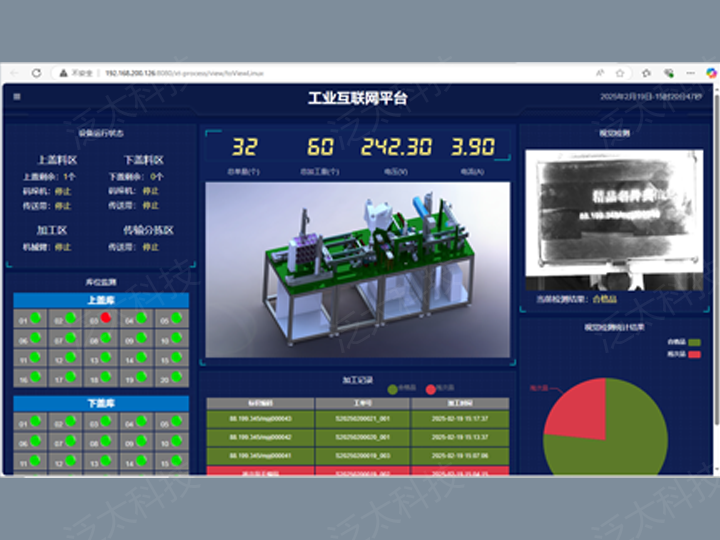 產(chǎn)線(xiàn)由原料碼垛、移載輸送、機器人裝配、雕刻檢測共4個(gè)工位、以及安全操作罩殼拼裝組合形成,結合邊緣服務(wù)器、工業(yè)互聯(lián)網(wǎng)融合平臺,通過(guò)工業(yè)網(wǎng)絡(luò )通信技術(shù),用戶(hù)直接使用微信小程序或移動(dòng)端APP下單觸發(fā)生產(chǎn),實(shí)現名片夾上下蓋的自動(dòng)取料、移載輸送、機器人自動(dòng)取針、裝針、頂針、合蓋、壓緊、中英文字符激光雕刻、名片夾表面劃痕瑕疵檢測、合格品及殘次品自動(dòng)分揀等功能,平臺能夠實(shí)時(shí)展示原材料庫存狀態(tài)、設備運行狀態(tài)、當前及歷史工單情況、視覺(jué)采集圖片與檢測結果、產(chǎn)線(xiàn)能量消耗等信息。